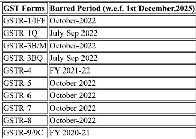 Illustration : For ease of reference and better clarity, the latest GST returns that will be barred from filing w.e.f 1st December 2025 are detailed in the table below: